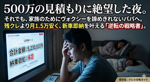 【深夜の絶望と、一筋の光】 正直に言おう。 年収500万前後のサラリーマンが、520万円の新型ヴォクシーを買うのは自殺行為だ。 時刻は深夜2時。 隣でスヤスヤと眠る妻と子供を起こさないように、 布団の中でスマホを睨みつけている……そう、あんたのことだ... -