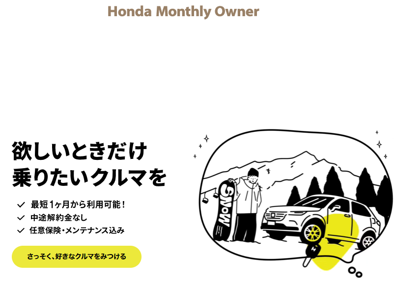 ホンダが提供する「ホンダマンスリーオーナー」は、月単位で利用でき、駐車場代とガソリン代以外の必要なクルマの維持費がすべてコミコミなので、カーリースとレンタカーの間を埋めるようなサービスが特徴です。