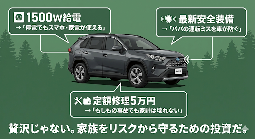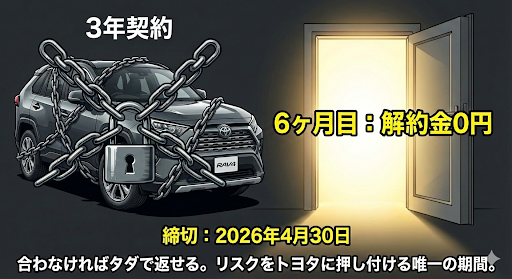「半年だけ、試させてくれ。 もしRAV4があっても 生活が豊かにならなかったら、 もし家計が苦しくなったら、 違約金ゼロでスパッと返す。 それならリスクはないだろ?」